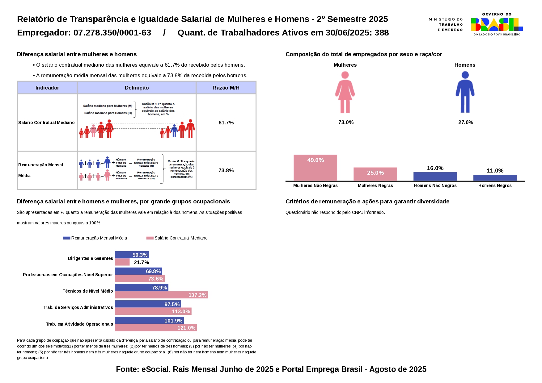 A publicação deste Relatório de Transparência Salarial e de Critérios Remuneratórios ("Relatório") é realizada em atendimento a Lei n.º 14.611/2023 e a Portaria 3.714/2023, que dispõem sobre a igualdade salarial e critérios remuneratórios entre mulheres e homens.
